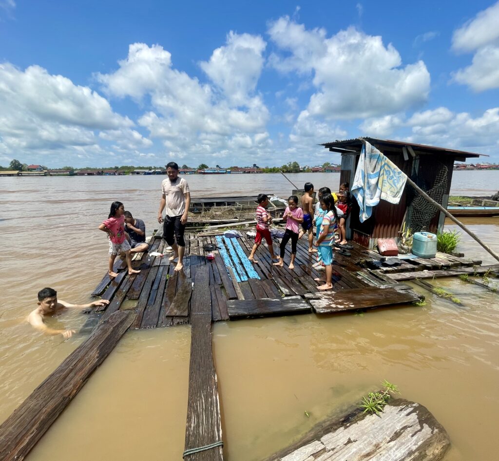 En fin d’après-midi, les enfants rentrent de l’école et nous accueillent avec une curiosité timide, munis de leurs cahiers d’anglais, impatients de pratiquer. Nous avons nagé dans la rivière Kapuas à leurs côtés. Ils nous ont guidés vers des endroits sûrs pour sauter, et bientôt des rires ont résonné parmi les arbres à kratom et les maisons flottantes.